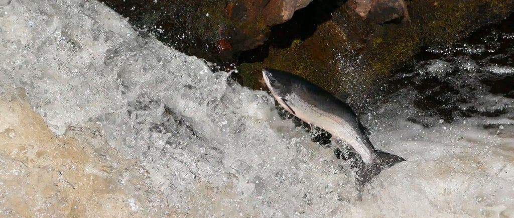 The actual time it takes these fish to leap up the falls is very brief, around one second, so observers need to keep their eyes fixed to catch the leaps. The falls here are narrow, so it is just a matter of patience. Every now and again, a very large salmon - some around 4 feet long - can be seen doing a spectacular leap. Even wee salmon and trout will try to sneak up the bank nearest the observation platform.